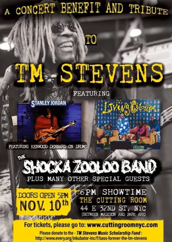 T.M. Stevens, a bass legend One night only Sunday November 10th Tribute Concert TICKETS Please join us in celebrating the musical mastery of the late T.M. Stevens at The Cutting Room in New York City. This is a unique opportunity to see star-studded artists such as jazz great Stanley Jordan, Grammy winning rock band Living Color, and T.M.'s funk-filled band Shocka Zooloo perform live, all for a good cause. They are donating their time and talents for this Benefit evening to support the T.M....